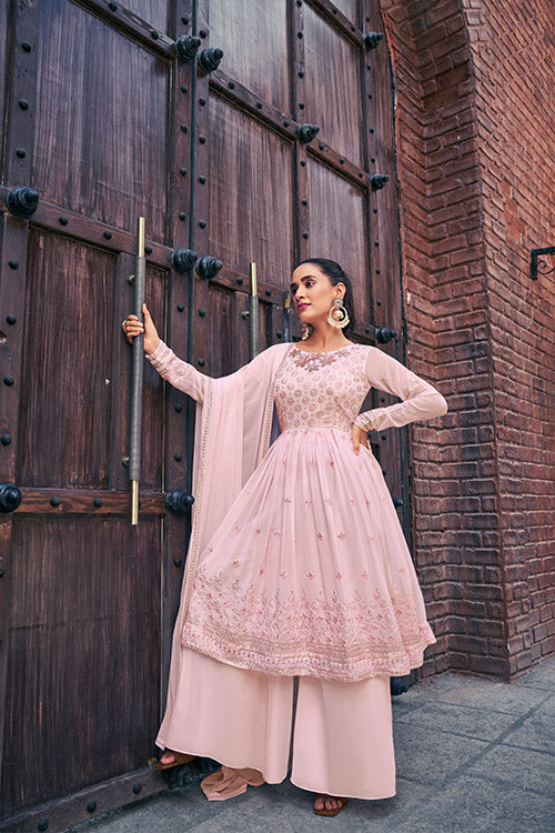 The 55-inch-long Kurta Flows Gracefully, Creating a Pink Palazzo Suit Set for All Body Types. The Soft Georgette Fabric Drapes Beautifully, Providing a Flattering and Timeless Appeal.paired With a Plain Georgette Palazzo, the Ensemble Strikes the Pink Palazzo Suit Set and Luxury.