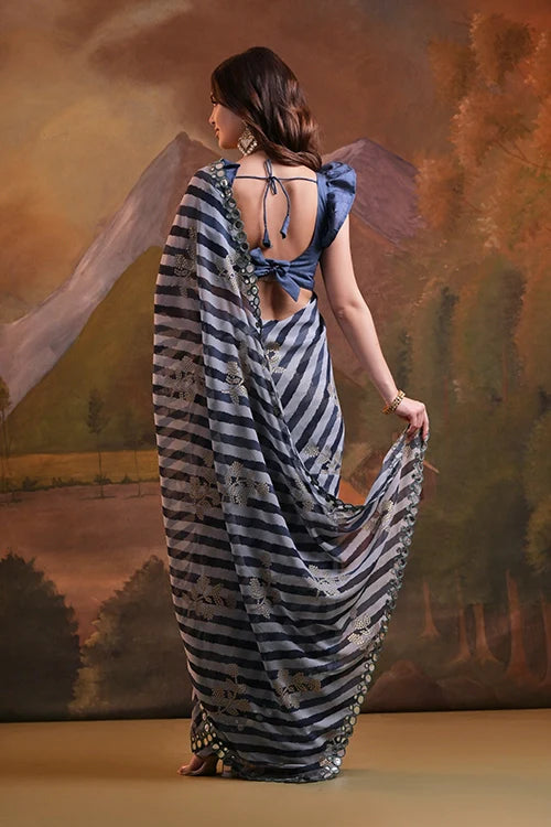 Drape Yourself in Elegance With Our , Featuring a Stunning Leriya Print and Intricate Mirror Work. This Exquisite Saree is Designed to Perfectly Balance Modernity and Tradition. It is an Ideal Choice for Festive Occasions, Weddings, and Parties.Black Saree with Mirror Work.