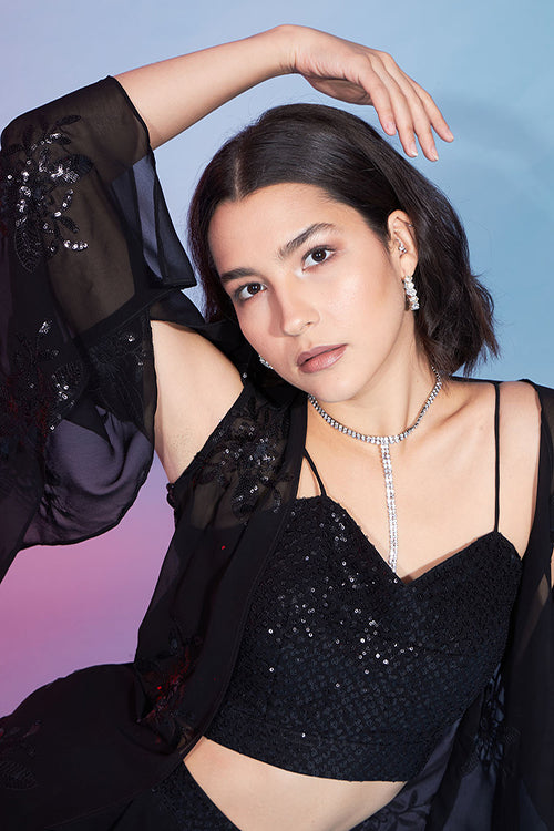 This Black Georgette Sequins Co-Ords Embodies Sophistication and Modern Style, Making It an Ideal Choice for Various Occasions. This Black Georgette Sequins Co-Ords, From Festive Celebrations to Evening Gatherings. Black Georgette Ensemble.