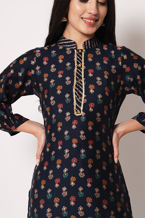 This Office Wear Chanderi Silk Stitched Foil Print Kurta Pant Set is an ideal choice for your workwear wardrobe. Featuring exquisite hand-stenciled foil work on the kurta and lightweight Chanderi fabric, this set offers a stylish yet comfortable experience.