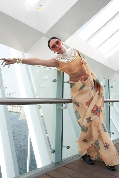 The charming Cream Digital Printed Tissue Silk Saree with Unstitched Blouse is a delightful masterpiece that seamlessly blends modernity with tradition. Crafted with precision and care, this saree is a testament to the beauty and versatility of Indian textiles.