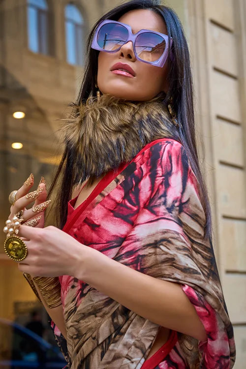 Brown & Pink Satin Crepe With Modern Contemporary Prints Work Saree.