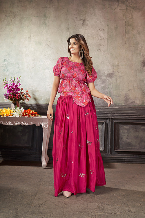 Deep Pink Art Silk Print With Sequins Embroidered Work Crop-Top. Deep Pink Art Silk Thread With Sequins Embroidered Work Skirt.