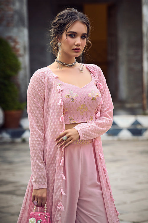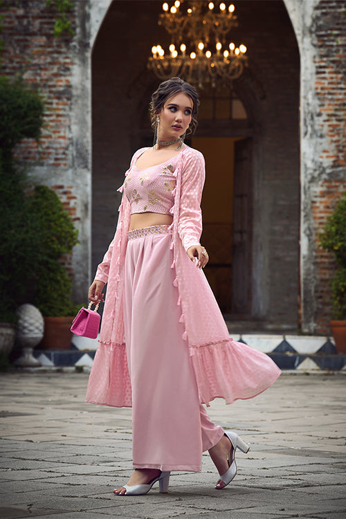 Dusty Pink Self Weaving Design Georgette Fabric With Embroidered Belt And Plain Palazzo. Dusty Pink Self Weaving Design Georgette Fabric With Embroidered Work Choli. Dusty Pink Self Weaving Design Georgette Fabric With Plain Koti.