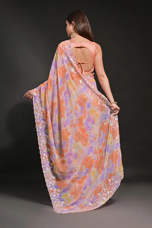SAREE FABRIC : Soft Georgette WORK - Prizam Printed Beautiful C Pallu Sequance Embroidery Cutwork Border BLOUSE FABRIC :Soft Georgette BLOUSE LENGTH : 0.80 MTR COLOR : FENTA