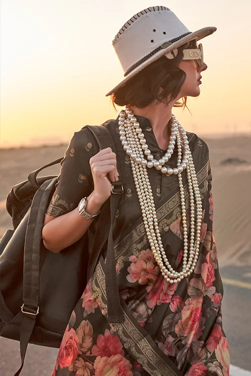 Floral prints have long been celebrated for their timeless appeal and romantic allure, and this saree is no exception. Delicate blooms dance across the fabric, weaving a tapestry of beauty and grace that evokes the splendor of a blossoming garden. Each petal and leaf is intricately rendered, creating a visual symphony that enchants the beholder and imbues the saree with a sense of whimsical charm.