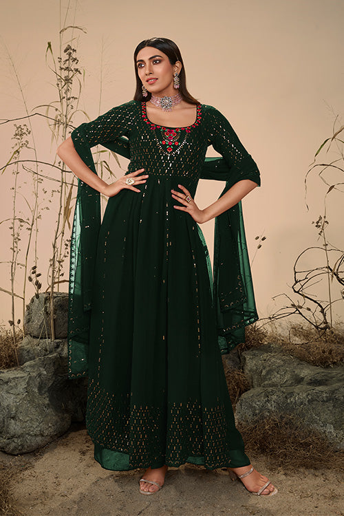 Georgette Embroidered Work Kurta Palazzo Dupatta Set | M / Darkgreen | Rs. 2,099.00