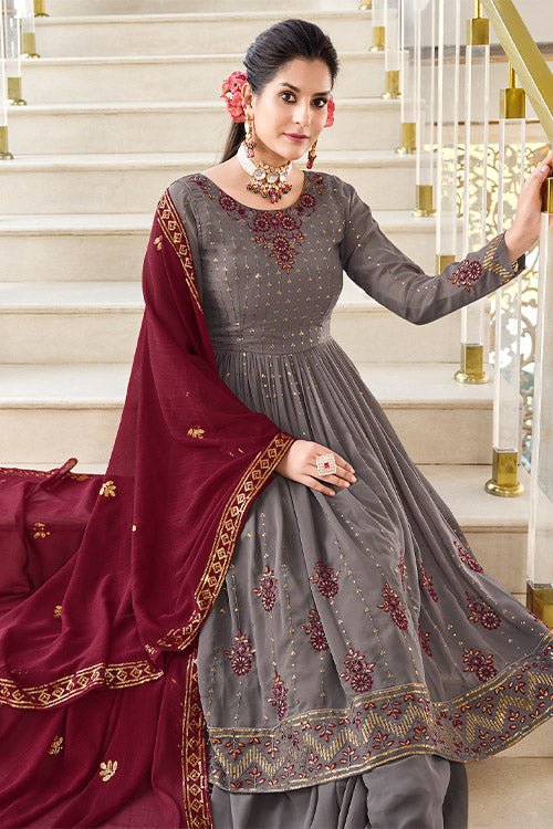 Grey Georgette Thread And Sequins Embroidered Work Kurta. Grey Georgette Palazzo. Wine Fancy Fabric Thread And Sequins Embroidered Work Dupatta.