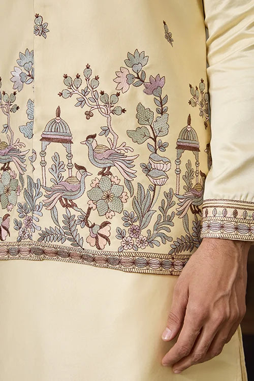 This Silk Kurta Set Is Crafted With Attention To Detail. The Light Yellow Shade Is Soft On The Eyes And Perfect For Daytime Events. The Fabric Feels Smooth And Rich, Making It Ideal For Festive Wear.