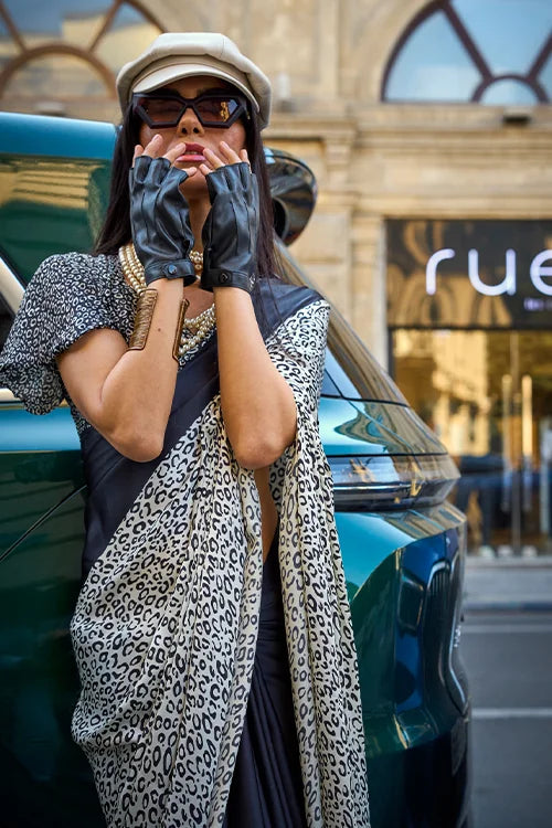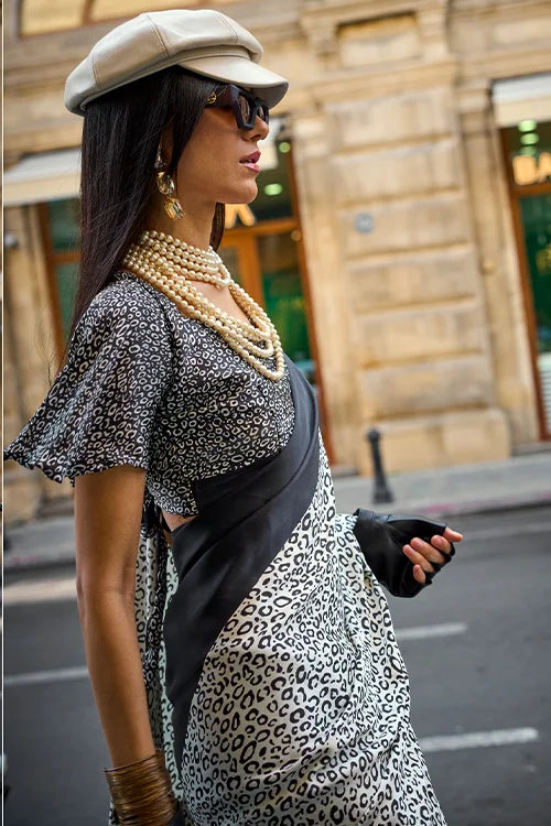 White & Black Satin Crepe With Modern Contemporary Prints Work Saree.