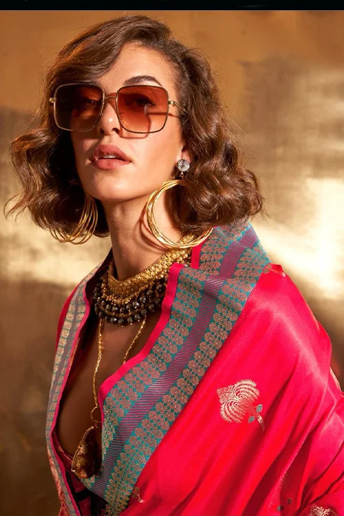 Pink Pure Satin Handloom Weaving Silk With Chaap Border Saree.