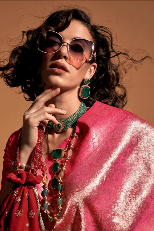 Light-Pink Soft Banarasi Silk Zari Kashmiri Weaving Handloom Saree.