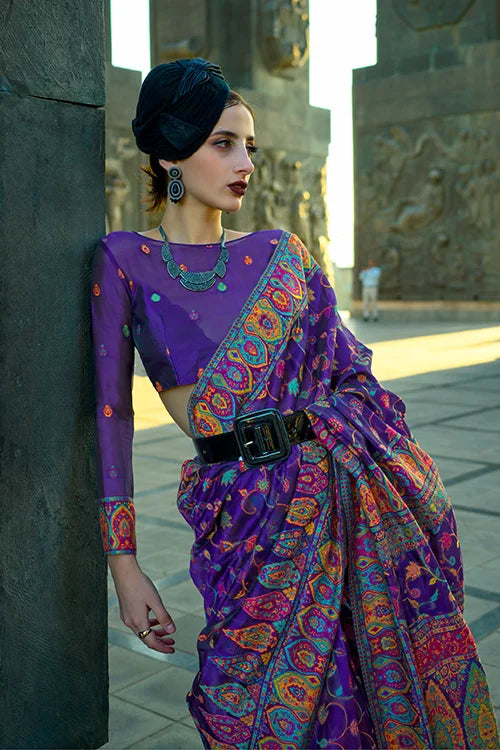 Blue Kashmiri Pashmina Organza With Handloom Weaving Silk Saree.