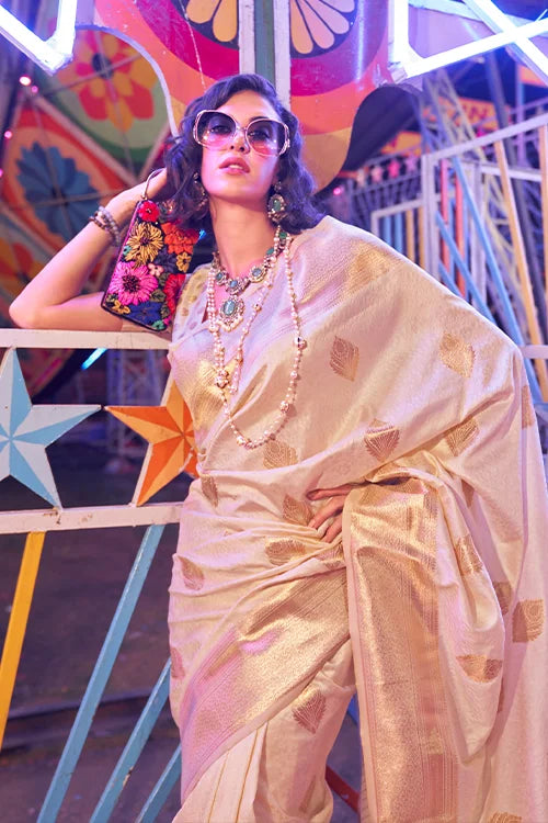 Cream Soft Banarasi Silk Zari Kashmiri Weaving Handloom Saree.