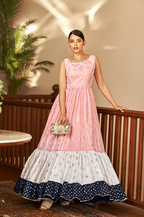 Multi Color Georgette Metalic Foil Work Beautiful Anarkali Long Gown. Pink Silk Crepe Inner In Gown.