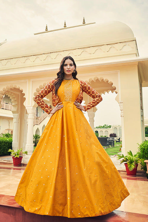 Mustard Yellow Cotton Sequince Embroidered Anarkali Gown. Mustard Yellow Silk Crepe Inner In Gown. Multi Cotton Thread With Sequince Embroidered 15 Inch 42-XL Size Of Koti.