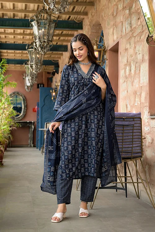 Navy Blue Rayon Designer Kurti Set with Chanderi Cotton Dupatta