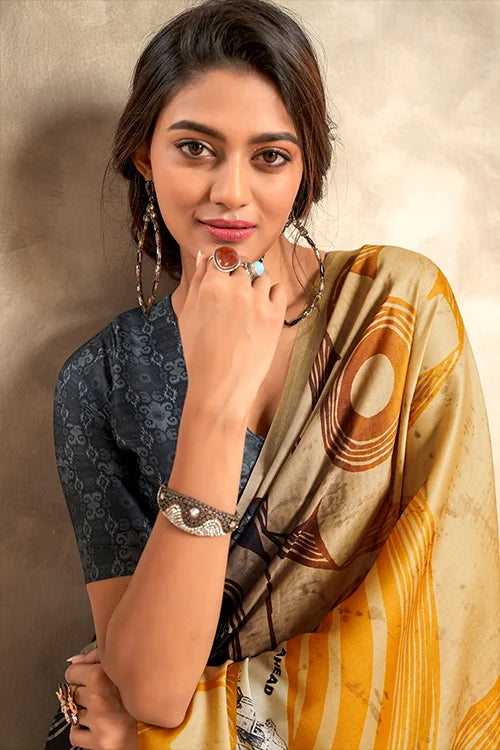 DETAILS OF SAREE & BLOUSE. SAREE FABRIC : Satin Crape WORK - Printed Work BLOUSE FABRIC : Satin Crape BLOUSE LENGTH : 0.80 MTR WASHING INSTRUCTIONS : Dry Clean Only