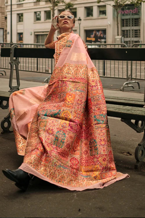 Peach Kashmiri Zari Weaving Satin Silk Saree.