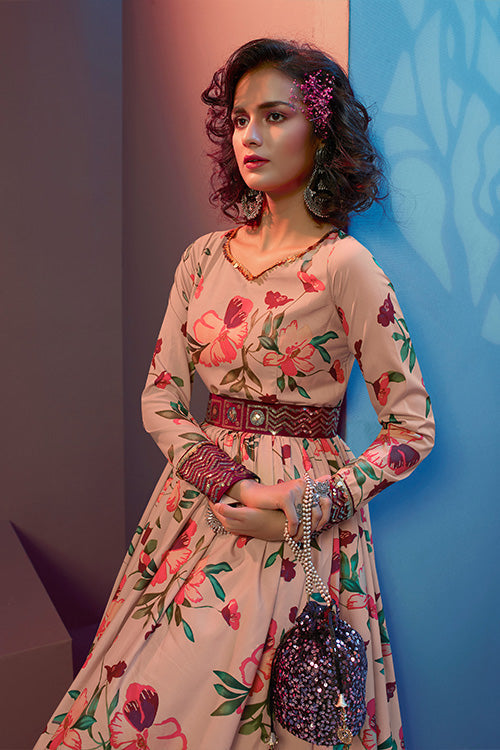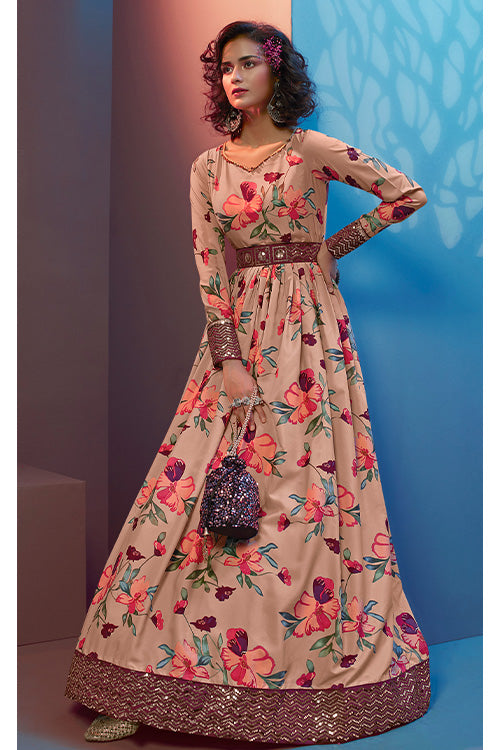 Peach Natural Crepe Print With Sequince Embroidered Work Long Gown. Peach Silk Crepe Inner In Gown. This Gown Comes With Fancy Sequinces Belt.