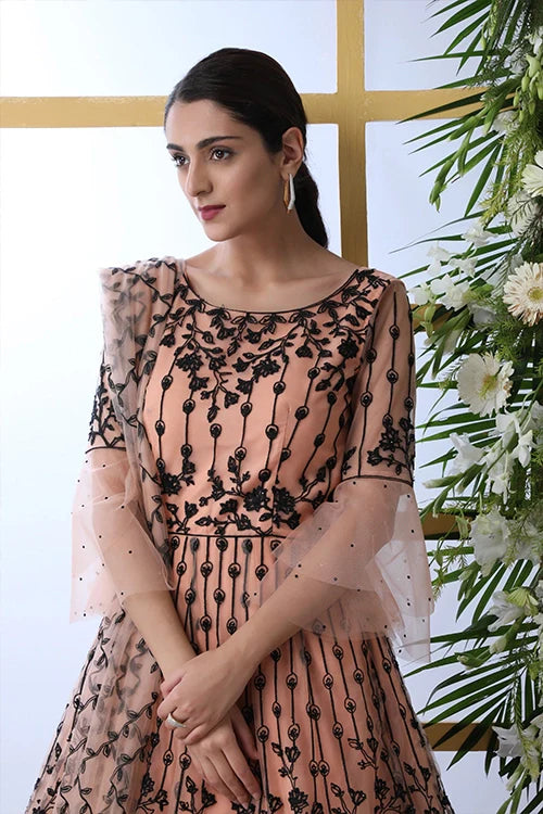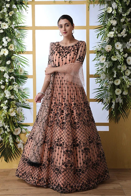 Peach Net Fabric Full Embroidered Stitched Anarkali Gown Collection | SEMI-STITCHED | Rs. 3,199.00
