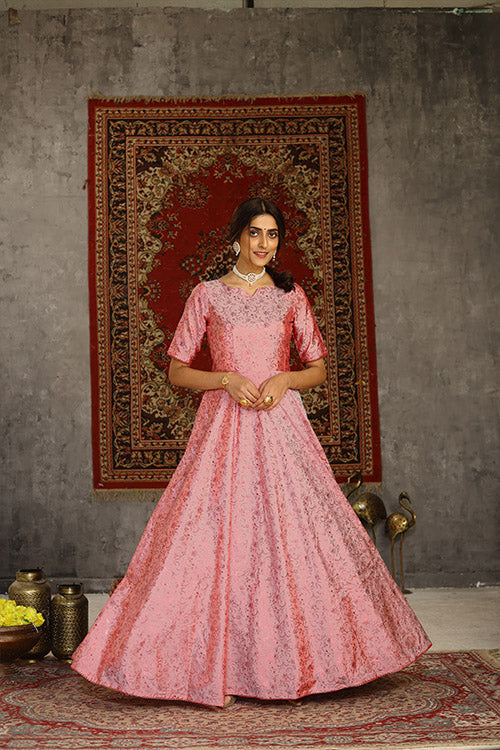Pink Taffeta Metalic Foil Work Beautiful Anarkali Long Gown