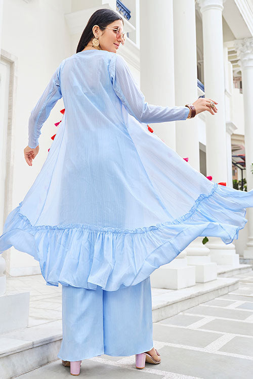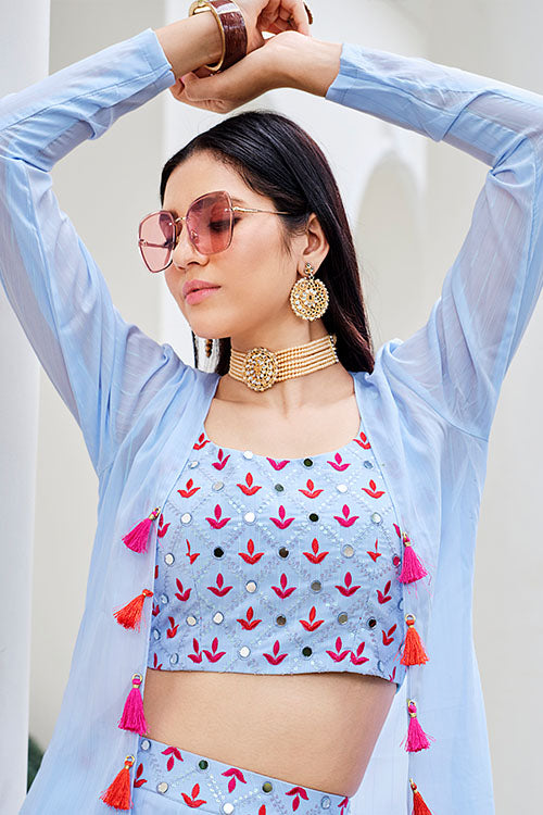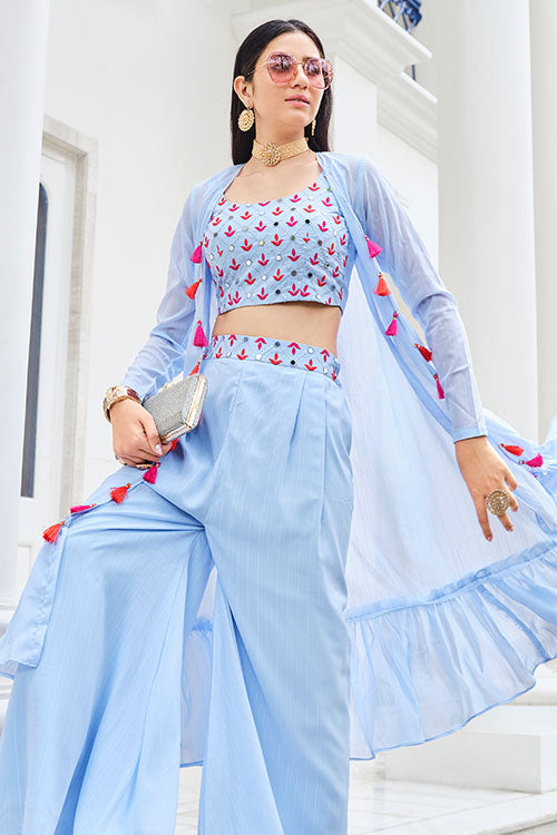 Sky Koti Style Mirror with Embroidered choli with Palazzo Set. Sky Belt Style Designer Mirror with Embroidered Work in Palazzo. Sky Exclusive Stylish Mirror with Embroidered Work in Koti.