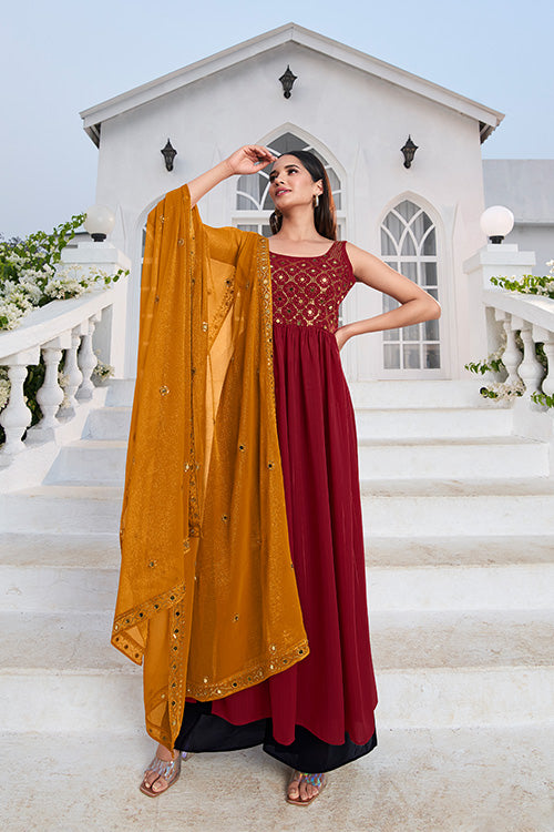 Red Georgette Thread And Sequins Embroidered Work Kurta. Navy Blue Georgette Palazzo. Yellow Shimmer Thread And Sequins Embroidered Work Dupatta.