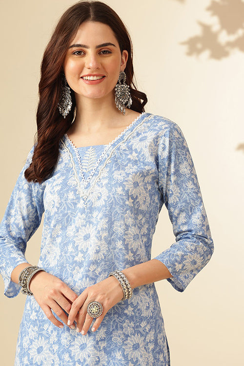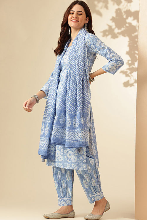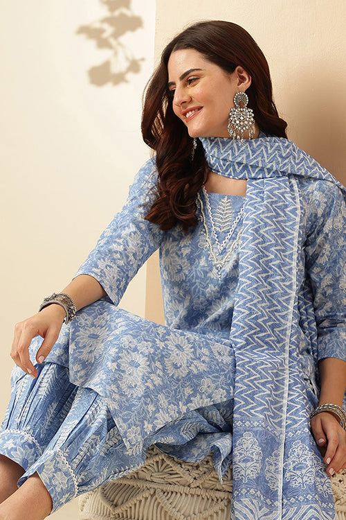 Sky Blue Kurti Set with Chanderi Cotton Dupatta - All Sizes