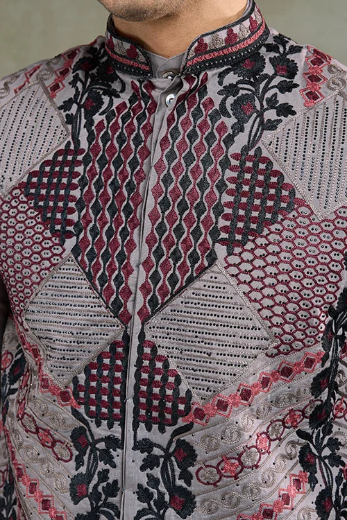 Kurta Fabric :-VISCOSE SILK KOTI JACKET FABRIC : - VISCOSE SILK KOTI JACKET WORK :- Thread Swarovski Embroidered Work Color :- GREY