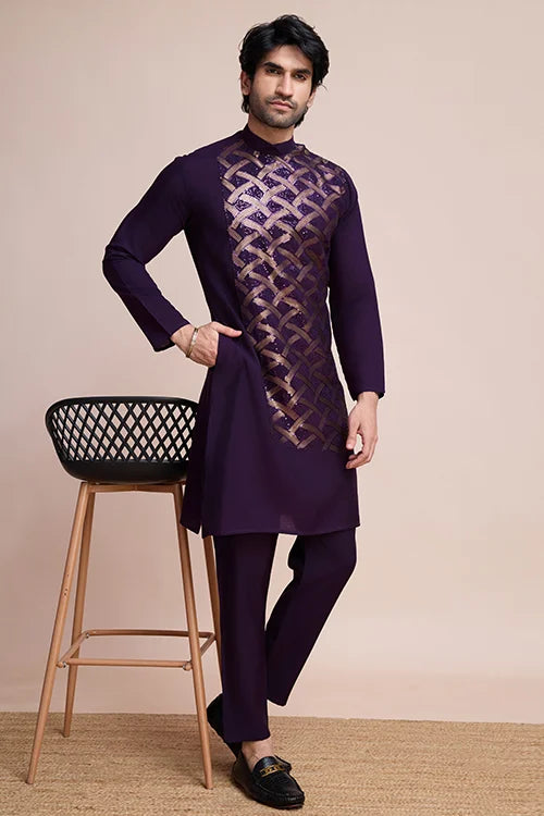The Purple Hue of the Kurta Symbolizes Royalty and Sophistication, Making It a Statement Piece for Any Occasion. Pair This Kurta With the Silk Bottom to Complete Your Harmonious Look. Designed for Modern Men Who Appreciate a Blend of Tradition and Contemporary Fashion, This Kurta Guarantees Unmatched Comfort and Style.