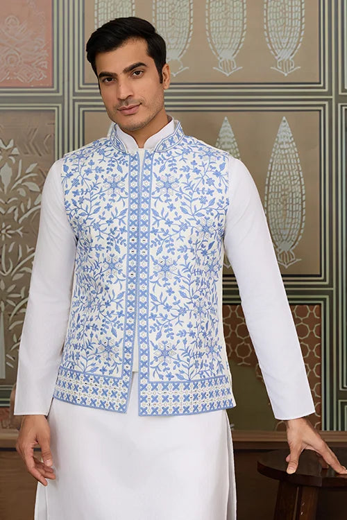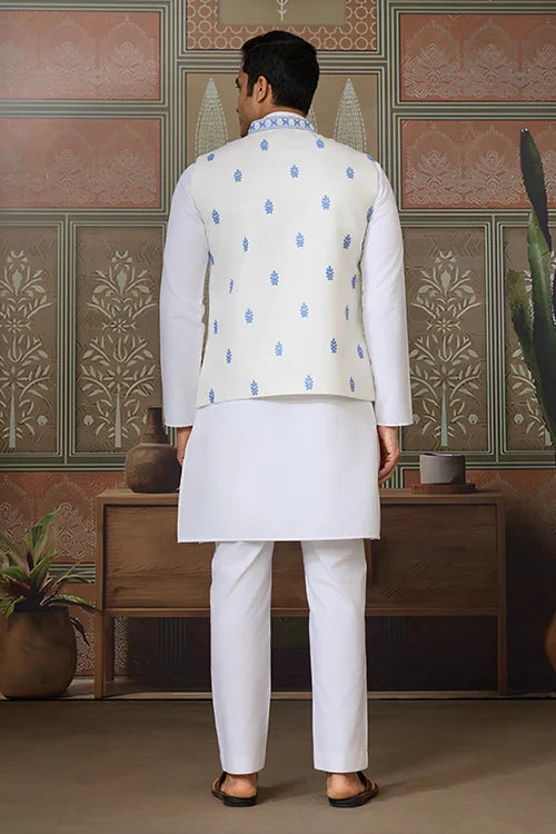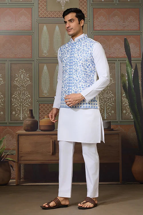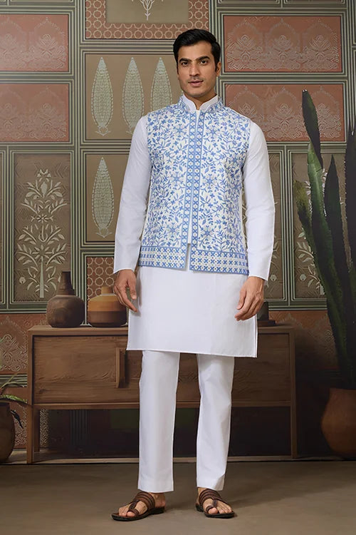 Traditional White Kurta Blue Koti Pajama for Men | M | Rs. 3,599.00