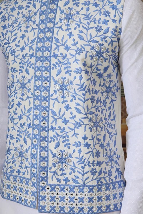 The Traditional White Kurta Blue Koti Pajama for Men is Designed for Those Who Appreciate Elegance, Class, and Cultural Style in One Outfit. Made From Premium Silk Fabric, This Set Combines Comfort With a Royal Touch, Making It an Ideal Choice for Weddings, Festive Functions, and Cultural Gatherings.