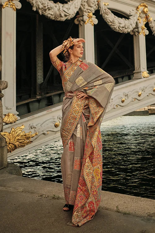 Beige & Brown Kashmiri Zari Weaving Satin Silk Unstitched Blouse.
