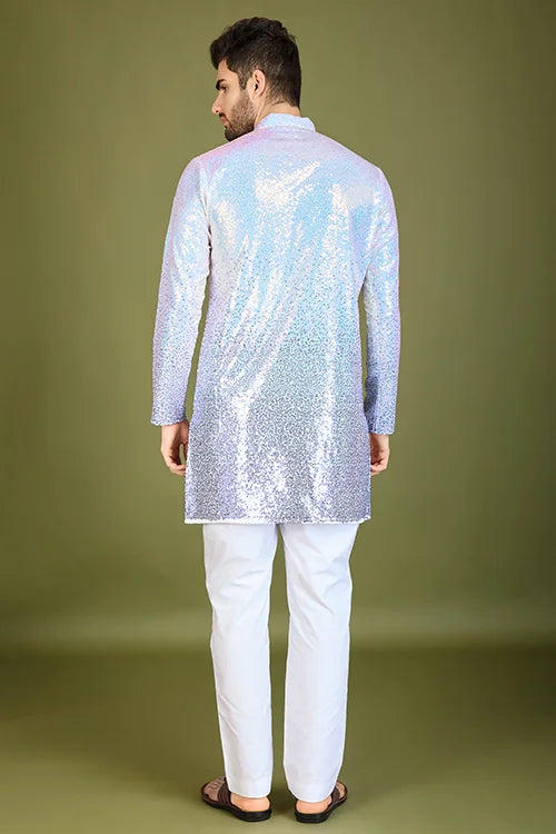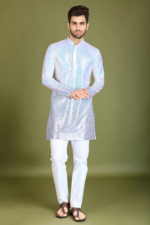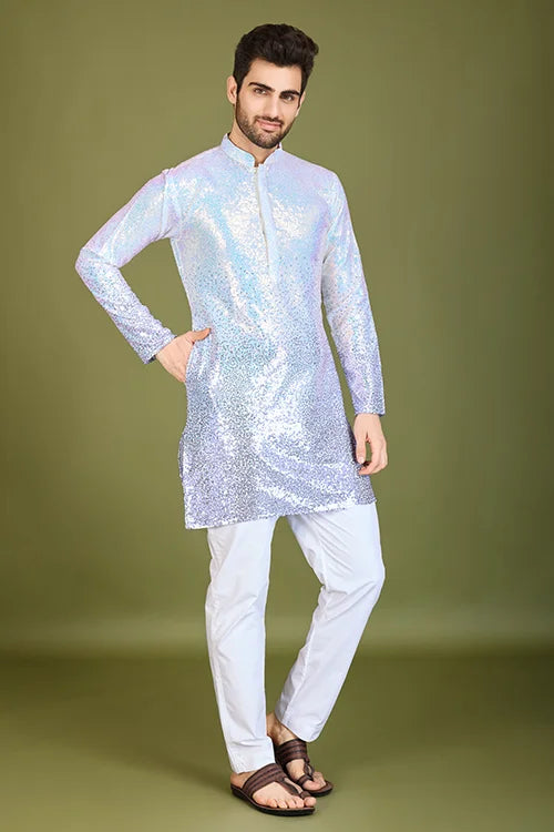 The Full-length Sleeves and Knee-length Hemline Make It Suitable for Traditional Events, Weddings, and Festive Celebrations. While the Kurta Does Not Come With a Bottom (Pant), It Pai Ombre Purple Men's Kurta Options. For a Classic Look, Combine It With White or Beige Churidar Pants. To Make a Bold Statement, Opt for Contrasting Colors Like Gold or Deep Maroon.