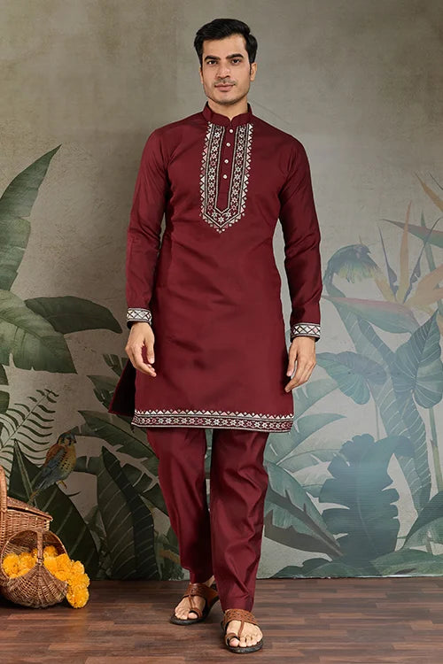 Make Your Special Day Even More Regal With This Maroon Kurta Pajama With Koti Designed Exclusively for Weddings and Festive Celebrations. Crafted From Luxurious Viscose Silk, This Wedding Special Ethnic Wear Features a Rich Maroon Color That Symbolizes Elegance and Tradition.