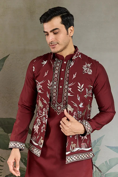 Wedding Special Maroon Kurta Pajama with Open Koti for Men