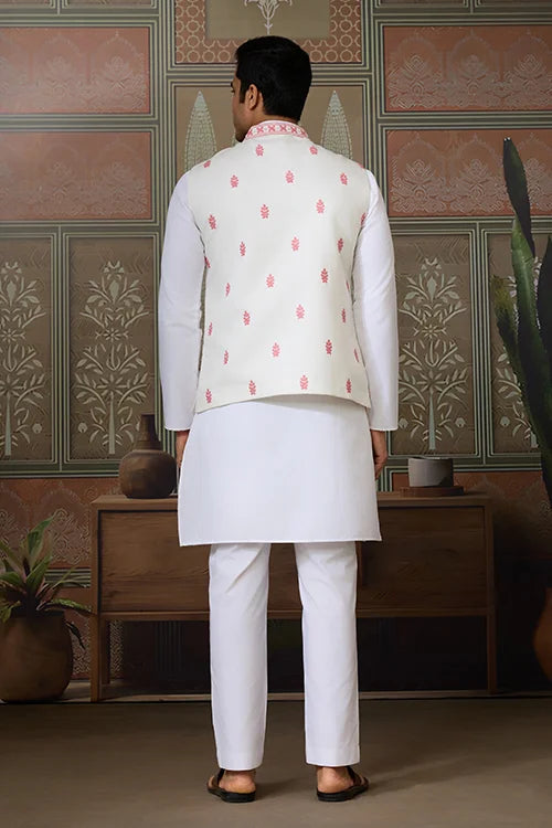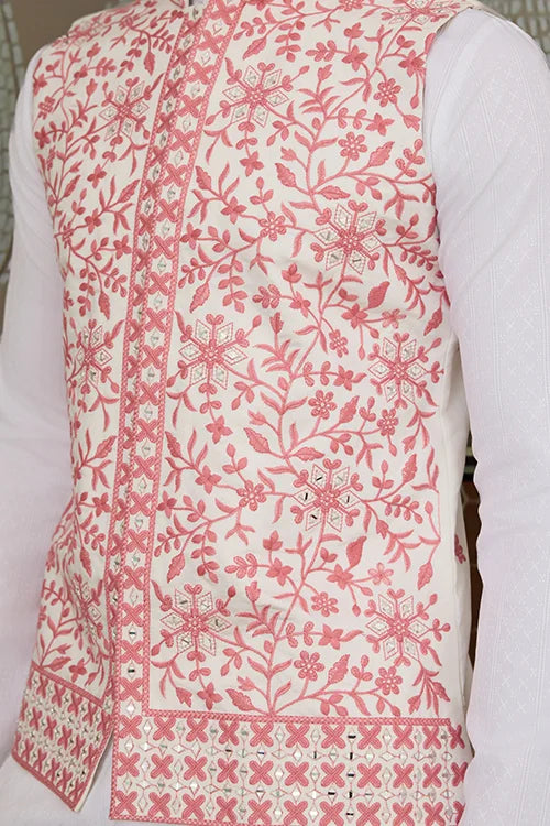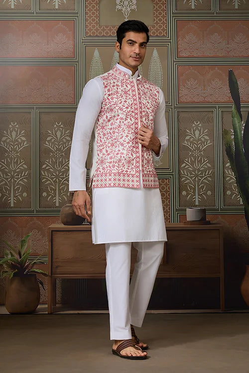This Wedding Pink Koti White Kurta Pajama is Designed for Men Who Want a Blend of Tradition and Elegance on Their Special Day. The Kurta, Crafted in Rich Silk Fabric, Comes in a Timeless White Shade That Symbolizes Purity and Sophistication. The Pink Silk Koti Adds a Royal Touch, Making It Perfect for Weddings, Festive Functions, and Cultural Events. The Complete Set Also Includes a White Silk Pajama, Giving You a Balanced and Graceful Look.