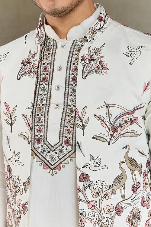 Wedding Special White Jacket Style Kurta Pajama Full Set