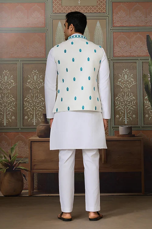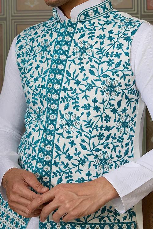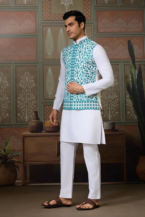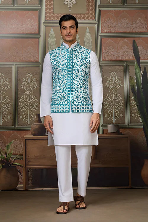 Traditional White Kurta with Teal Green Koti for Men
