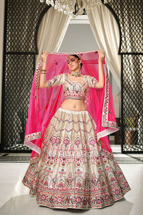 White Silk Thread With Sequince Embroidered Lehenga Choli. White Silk Thread With Sequince Embroidered Work in Choli. Deep Pink Silk Thread With Sequince Embroidered Work in Dupatta. Disclaimer: This semi-stitched Lehenga Choli set will not come with drawstring and latkan. Can-Can attached inside.